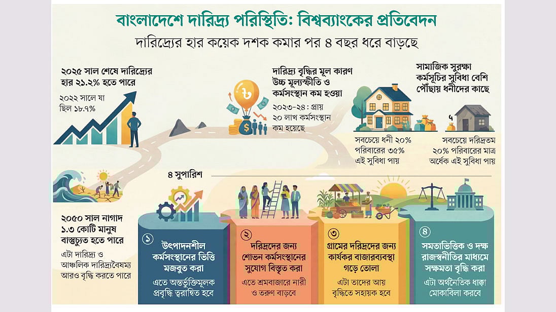 দারিদ্র্য কমানোর ক্ষেত্রে উল্টো পথে হাঁটছে বাংলাদেশ। বিশ্বব্যাংক বলছে, দেশে চার বছর ধরে দারিদ্র্যের হার বাড়ছে। সংস্থাটির অনুমিত হিসাব, ২০২৫ সালে দারিদ্র্যের হার হতে পারে ২১ শতাংশের কিছু বেশি। দেশে দরিদ্র মানুষের সংখ্যা দাঁড়িয়েছে ৩ কোটি ৬০ লাখ।