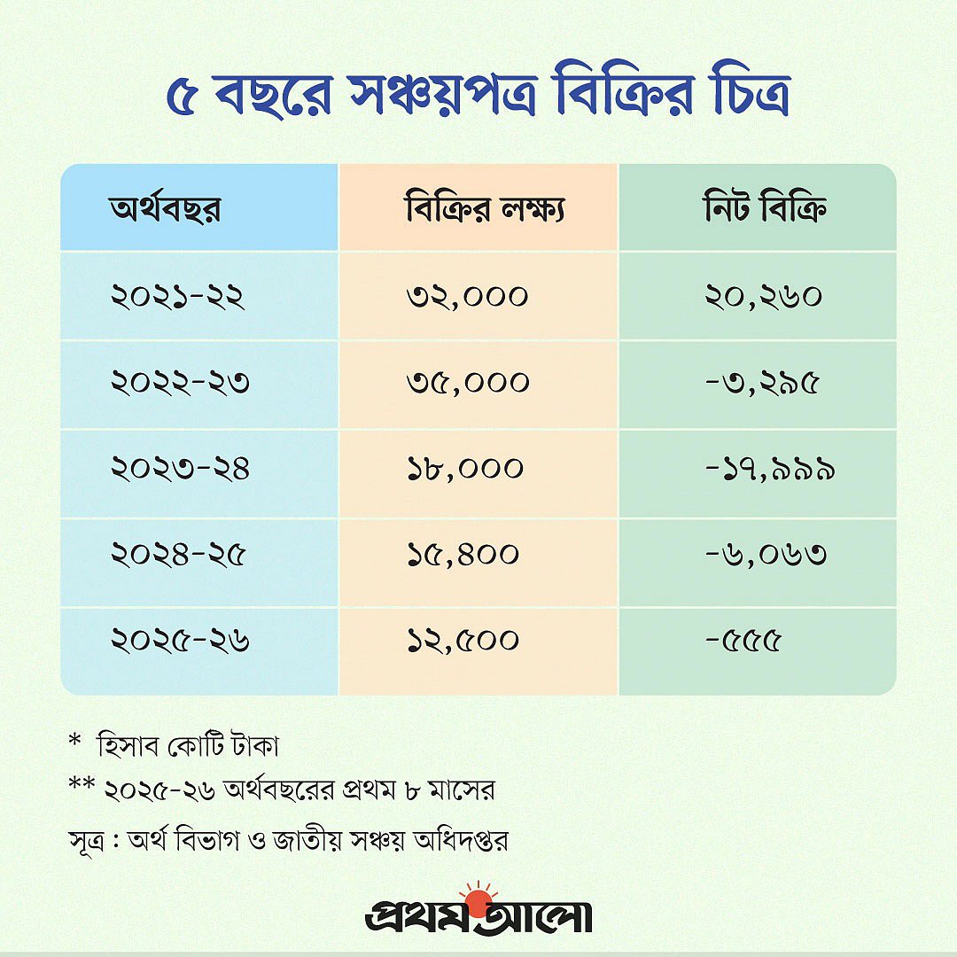 চলতি অর্থবছরের ৮ মাসে (জুলাই-ফেব্রুয়ারি) নিট বিক্রি হয়েছে ঋণাত্মক ৫৫৫ কোটি টাকা। অর্থাৎ এই ৮ মাসে যত টাকার সঞ্চয়পত্র বিক্রি হয়েছে, মেয়াদপূর্তি এবং মেয়াদ শেষ হওয়ার আগে ভেঙে ফেলার কারণে তার চেয়ে ৫৫৫ কোটি টাকা বেশি ব্যয় করতে হয়েছে সরকারকে। এর মানে, বাজেটের ঘাটতি পূরণে সরকার সঞ্চয়পত্র বিক্রি করে কোনো টাকা নিতে পারছে না। উল্টো বাড়তি টাকা খরচ করে সঞ্চয়পত্রের ভাঙানো টাকার জোগান দিতে হচ্ছে।