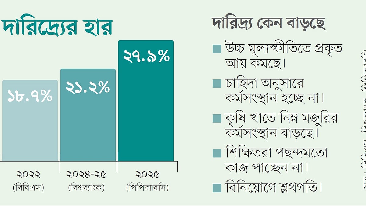 পিপিআরসির মতো সম্প্রতি বিশ্বব্যাংক তাদের সর্বশেষ প্রতিবেদনে বলেছে, ২০২৩-২৪ অর্থবছরে দেশে দারিদ্র্যের হার ছিল সাড়ে ২০ শতাংশ। ২০২৪-২৫ অর্থবছরে এসে তা বেড়ে দাঁড়ায় ২১ দশমিক ২ শতাংশে।