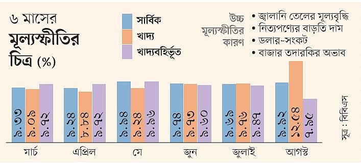 তুলনামূলকভাবে উচ্চ মূল্যস্ফীতির স্তরে দেশের যাত্রা গত বছরের আগস্টে। ওই মাসে জ্বালানি তেলের দাম হঠাৎ বেশ বাড়ানো হয়। ফলে মূল্যস্ফীতি বেড়ে দাঁড়ায় ৯ দশমিক ৫২ শতাংশ। আর এ বছরের আগস্ট মাসে ৯ দশমিক ৯২ শতাংশ বেশি দামে পণ্য কিনতে হয়েছে। এতেই বোঝা যায়, সাধারণ মানুষের ওপর মূল্যস্ফীতির চাপ এক বছরের ব্যবধানে কতটা বেড়েছে। গত বছরের আগস্টের পর আর কখনোই মূল্যস্ফীতি সাড়ে ৮ শতাংশের নিচে নামেনি।