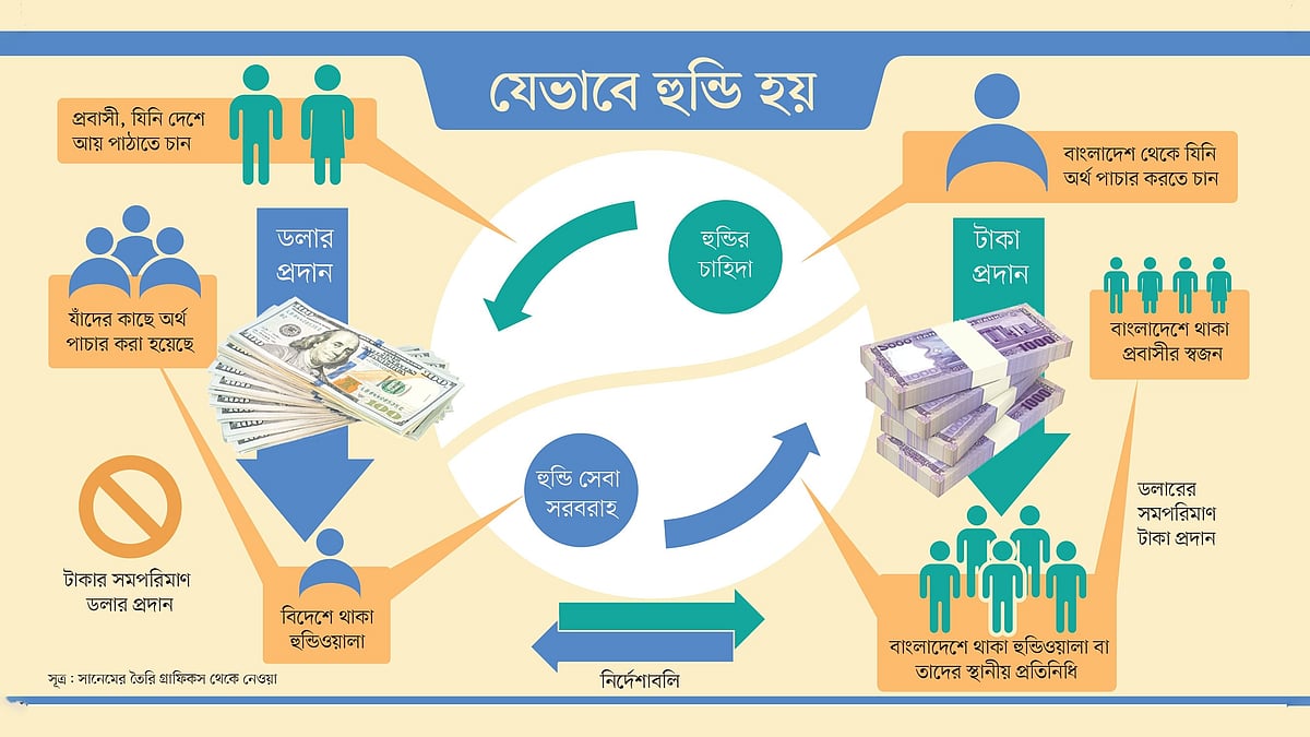 হুন্ডি কেন এত জনপ্রিয়? প্রবাসীরা ডলারের বেশি দর পেতে ব্যাংকিং চ্যানেলের বাইরে দেশে অর্থ পাঠাতে চায় বলে হুন্ডি বাড়ছে, নাকি দেশের মধ্যে অনানুষ্ঠানিকভাবে ডলার কেনাবেচার প্রয়োজন পড়ছে। মূল বিষয় হচ্ছে চাহিদা। চাহিদা বেশি বলেই হুন্ডি বাড়ছে। যাঁরা ভিন্ন পথে অর্থ লেনদেন করবেন, তাঁদের কাছে ডলারের হার কত, সেটা বিষয় নয়। চাহিদা অনুযায়ীই হুন্ডিওয়ালারা ডলারের হার নির্ধারণ করে থাকেন।