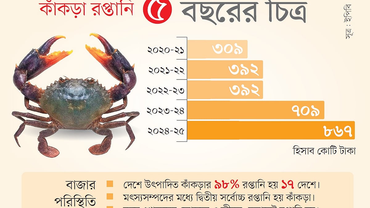 রপ্তানি উন্নয়ন ব্যুরোর (ইপিবি) তথ্য অনুযায়ী, ২০২০-২১ অর্থবছরে দেশ থেকে ৩০৯ কোটি টাকার কাঁকড়া রপ্তানি হয়েছিল, যা সদ্য বিদায়ী ২০২৪-২৫ অর্থবছরে বেড়ে দাঁড়িয়েছে ৮৬৭ কোটি ৮৮ লাখ টাকা। অর্থাৎ পাঁচ বছরে কাঁকড়া রপ্তানি বেড়ে প্রায় ৩ গুণ হয়েছে।
