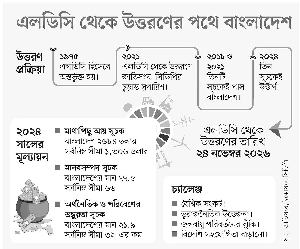 স্বল্পোন্নত দেশের (এলডিসি) তালিকা থেকে উত্তরণের সর্বশেষ মূল্যায়নেও বাংলাদেশ বেশ ভালোভাবে পাস করেছে। জাতিসংঘের ২০২৪ সালের ত্রিবার্ষিক মূল্যায়নে মাথাপিছু আয়, মানবসম্পদ, জলবায়ু ও অর্থনৈতিক ভঙ্গুরতা—এই তিন সূচকেই বাংলাদেশ উত্তীর্ণ হয়েছে। এলডিসি থেকে উত্তরণ হয়েছে কিংবা হওয়ার পথে রয়েছে এমন দেশগুলোর মধ্যে একমাত্র বাংলাদেশই টানা তিনটি মূল্যায়নে সব সূচকে পাস করেছে। গত ফেব্রুয়ারি মাসে জাতিসংঘের কমিটি ফর ডেভেলপমেন্ট পলিসির (সিডিপি) ত্রিবার্ষিক প্রতিবেদনে এভাবেই বাংলাদেশের সম্ভাবনা তুলে ধরা হয়েছে।