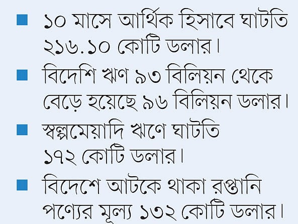 দেশের ব্যাংক ও আর্থিক প্রতিষ্ঠানগুলো বিদেশি ব্যাংক থেকে যে ঋণ ও ঋণসীমা নিত, তা–ও কমে এসেছে। গত এপ্রিল পর্যন্ত যাতে ঘাটতি হয়েছে ২৭৬ কোটি ডলার। এর ফলে সামগ্রিকভাবে দেশের আর্থিক হিসাবে ঘাটতি তৈরি হয়েছে।