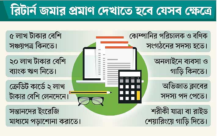 ২০ লাখ টাকার বেশি ব্যাংকঋণ পাওয়া, পাঁচ লাখ টাকার বেশি সঞ্চয়পত্র কেনা, ক্রেডিট কার্ড ব্যবহার, অনলাইনে বেচাকেনার ব্যবসা, রাইড শেয়ারিং বা শরিকি যাত্রায় মোটরগাড়ি দেওয়া ইত্যাদি। এমনকি সন্তানকে ইংরেজি সংস্করণে (ইংলিশ ভার্সন) পড়াশোনা করালেও রিটার্ন জমা দিতে হবে। তাই ভবিষ্যতে এসব সেবা পেতে এবার রিটার্ন দিতেই হবে। এ ছাড়া গাড়ির মালিক, অভিজাত ক্লাবের সদস্য, কোম্পানি পরিচালক, বণিক সংগঠনের সদস্য, পৌর থেকে জাতীয় নির্বাচন পর্যন্ত প্রার্থী হলেও রিটার্ন দিতে হবে।
