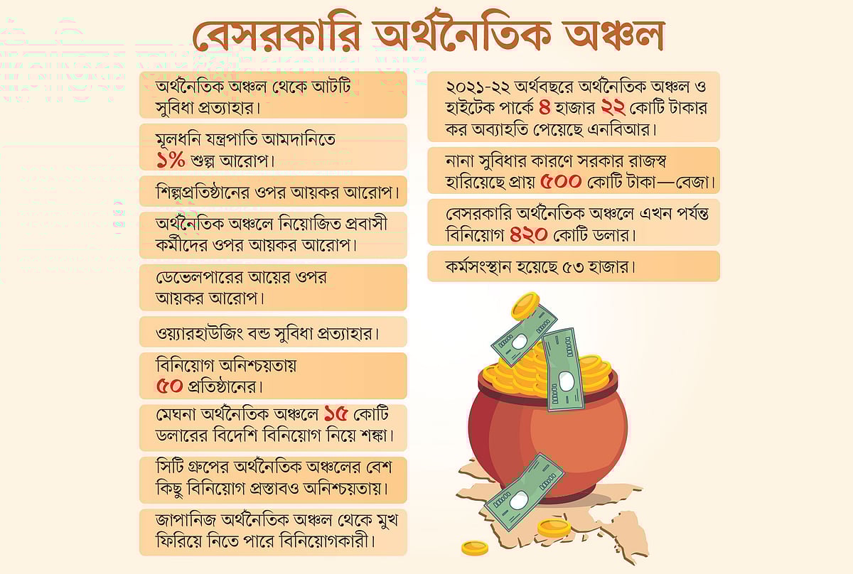 গত ২৯ মে এক প্রজ্ঞাপনে বেসরকারি অর্থনৈতিক অঞ্চল থেকে আটটি সুবিধা প্রত্যাহারের কথা জানায় এনবিআর। শিল্পপ্রতিষ্ঠানের মূলধনি যন্ত্রপাতি ও অন্যান্য পণ্য আমদানিতে এত দিন শুল্ক অব্যাহতিসহ নানা সুবিধা ছিল। প্রস্তাবিত ২০২৪–২৫ অর্থবছরের বাজেটে মূলধনি যন্ত্রপাতি, যন্ত্রাংশ ও নির্মাণ উপকরণ আমদানিতে ১ শতাংশ শুল্ক আরোপ করা হয়।