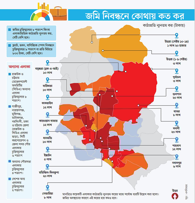 অর্থমন্ত্রী নতুন বাজেটে এলাকাভিত্তিক কাঠাপ্রতি ন্যূনতম করও নির্ধারণ করে দিয়েছেন। যেমন ঢাকার গুলশান, বনানী, মতিঝিল, দিলকুশা, নর্থ সাউথ রোড, মহাখালী এলাকায় জমি নিবন্ধন করা হলে চুক্তিমূল্য বা বিক্রয়মূল্যের ৮ শতাংশ কিংবা কাঠাপ্রতি ২০ লাখ টাকার মধ্যে যেটি বেশি হবে, ওই পরিমাণ কর দিতে হবে। এর মানে, ওই সব এলাকায় প্রতি কাঠায় ২০ লাখ টাকা কর দিতেই হবে।