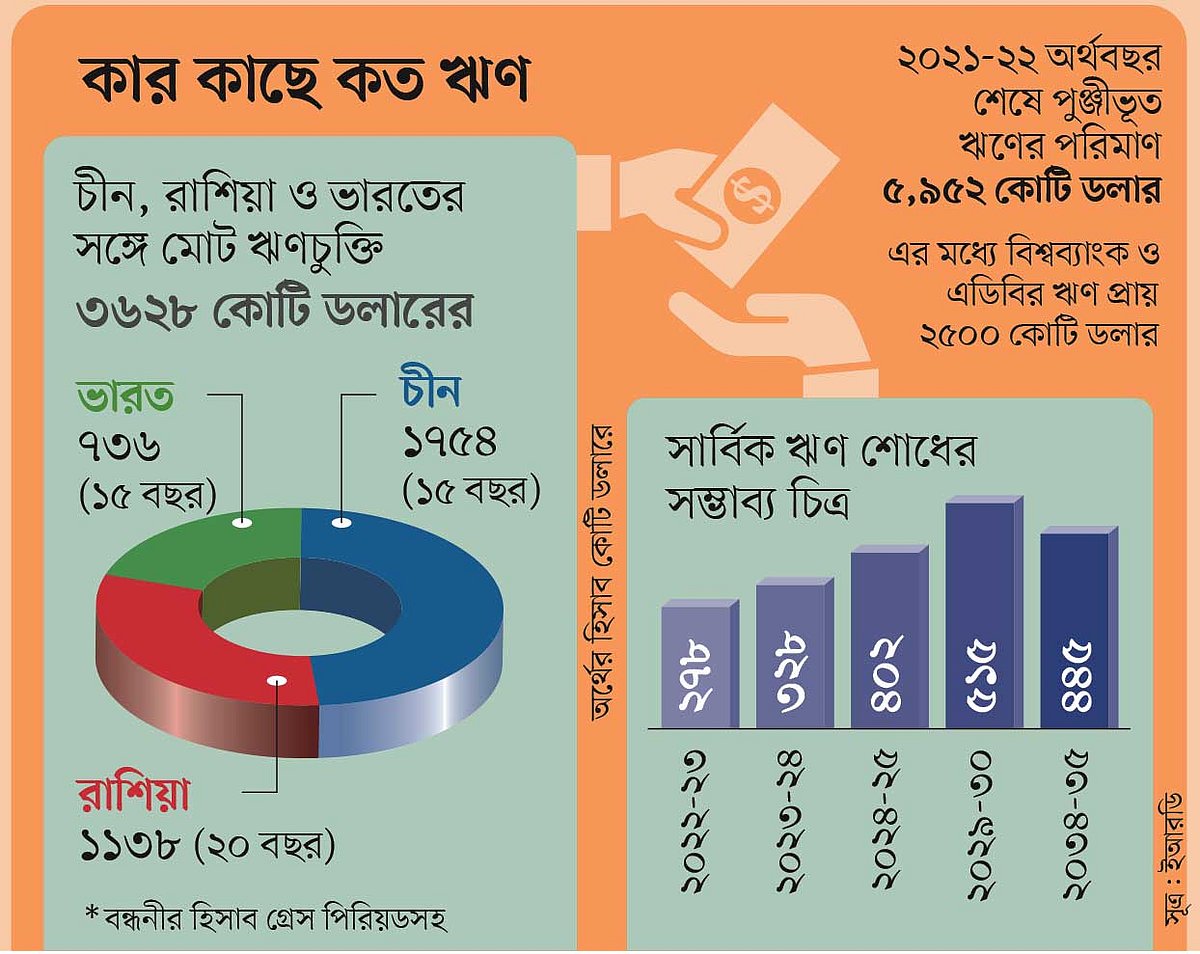 রাশিয়া, চীন ও ভারতের কাছ থেকে নেওয়া কঠিন শর্তের ঋণগুলোই বেশি ভোগাবে। এ তিন দেশের কাছ থেকে এ পর্যন্ত সাড়ে তিন লাখ কোটি টাকার বেশি ঋণচুক্তি হয়েছে। আগামী ১০ থেকে ১৫ বছরের মধ্যে সুদ, আসলসহ এ বিপুল অঙ্কের ঋণ পরিশোধ করতে হবে। দায় বেড়ে যাওয়ায় আগামী তিন বছরের মধ্যে ঋণ পরিশোধের পরিমাণ দ্বিগুণ হবে।
