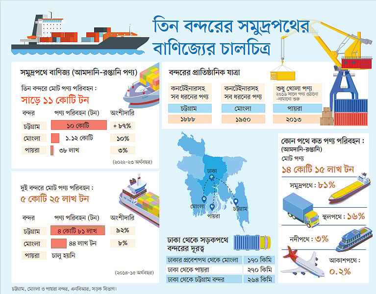 সমুদ্রপথে দেশের আমদানি-রপ্তানি পণ্য পরিবহন হয় তিনটি সমুদ্রবন্দর দিয়ে। এই তিন সমুদ্রবন্দরের মধ্যে চট্টগ্রাম বন্দর দিয়ে সবচেয়ে বেশি পণ্য আনা-নেওয়া হয়। তবে ৯ বছরের ব্যবধানে সমুদ্রপথে পণ্য পরিবহনে চট্টগ্রামের একচেটিয়া অংশীদারি সামান্য কিছু কমেছে। চট্টগ্রামের এই অংশীদারি নিতে শুরু করেছে মূলত মোংলা বন্দর। সমুদ্রপথের বাণিজ্যের অংশীদারিতে যুক্ত হয়েছে নতুন সমুদ্রবন্দর পায়রাও।