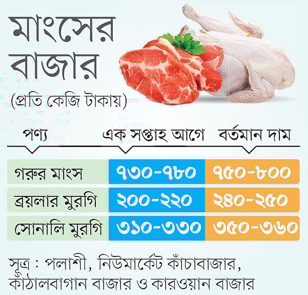 ক্রেতা ও বিক্রেতারা বলছেন, ঈদ উৎসবের সময় মাংসের চাহিদা বেড়ে যায়, বেশি বাড়ে মুরগির চাহিদা। এই বাড়তি চাহিদাকে পুঁজি করে মাংসের দাম দফায় দফায় বাড়ানো হচ্ছে। গত তিন দিনে বাজারে প্রতিদিনই কোনো না কোনো মাংসের দাম বেড়েছে।