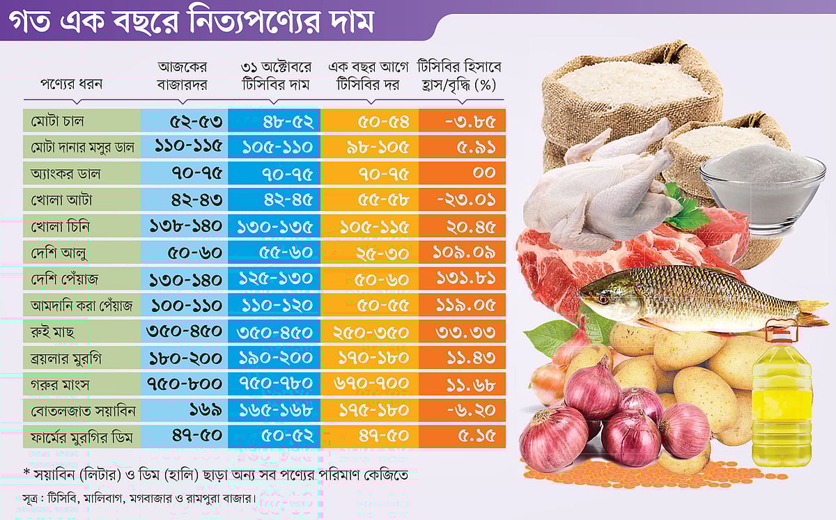 সরকারি সংস্থা ট্রেডিং করপোরেশন অব বাংলাদেশের (টিসিবি) হিসাবেই দেখা যায়, গত এক বছরে বাজারে বেশ কিছু নিত্যপণ্যের দাম বেশ বেড়েছে। দু–একটার দাম একই রকম আছে। আর হাতে গোনা কয়েকটি পণ্যের দাম কিছুটা কমেছে।