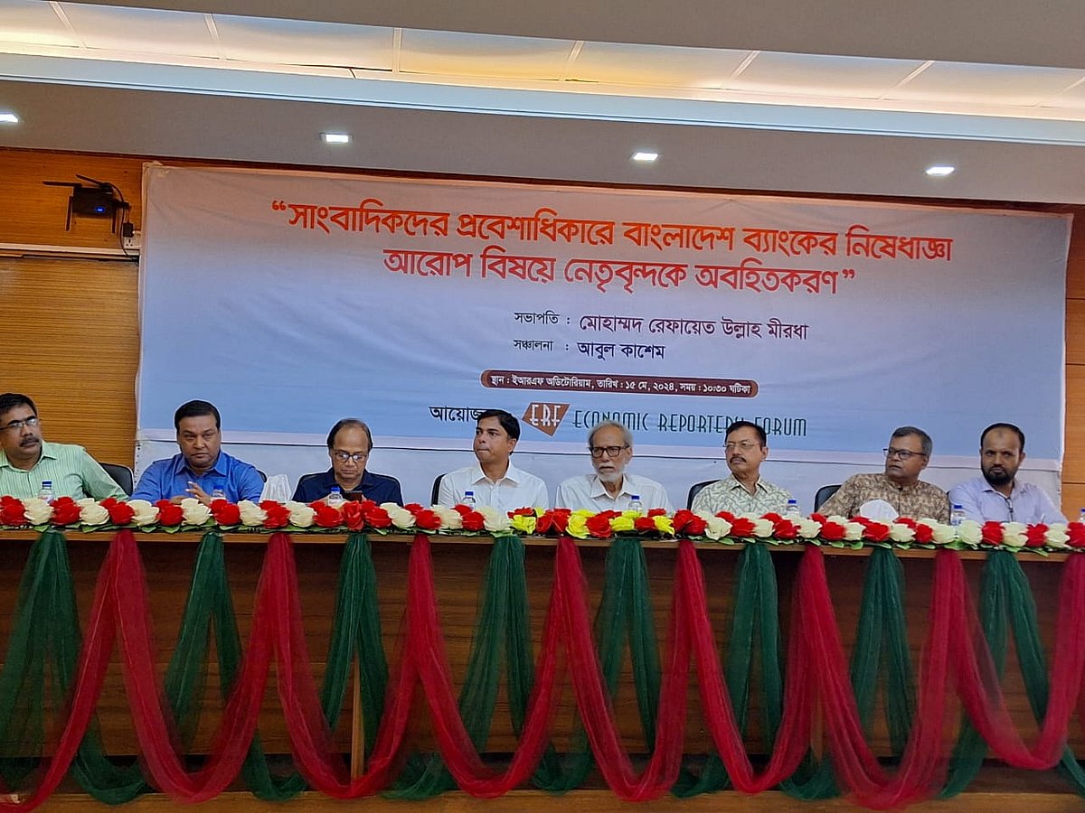 আজ বুধবার অর্থনীতিবিষয়ক সাংবাদিকদের সংগঠন ইকোনমিক রিপোর্টার্স ফোরাম (ইআরএফ) আয়োজিত ‘সাংবাদিকদের প্রবেশাধিকারে বাংলাদেশ ব্যাংকের নিষেধাজ্ঞা আরোপ বিষয়ে নেতৃবৃন্দকে অবহিতকরণ’ শীর্ষক এক সভায় সাংবাদিক নেতারা নিজেদের অভিমত দেন। এতে সভাপতিত্ব করেন ইআরএফ সভাপতি রেফায়েত উল্লাহ মীরধা। অনুষ্ঠানটি সঞ্চালনা করেন সংগঠনটির সম্পাদক আবুল কাশেম।