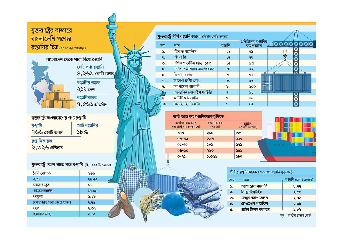 ২০২৩–২৪ অর্থবছরে যুক্তরাষ্ট্রে বাংলাদেশের মোট পণ্য রপ্তানির ৮৭ শতাংশই ছিল তৈরি পোশাক, যার মূল্য ৬৬৯ কোটি মার্কিন ডলার। ১ হাজার ৮১০টি প্রতিষ্ঠান গত অর্থবছর যুক্তরাষ্ট্রে তৈরি পোশাক রপ্তানি করেছে। এ জন্যই ট্রাম্পের পাল্টা শুল্ক নিয়ে পোশাকশিল্পেই দুশ্চিন্তা বেশি।