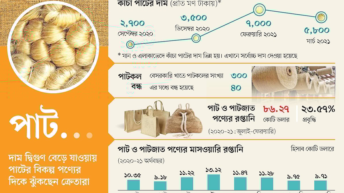 বেসরকারি পাটকলমালিকেরা বলছেন, কাঁচা পাটের দাম দ্বিগুণের বেশি হয়ে গেছে। পাটপণ্যের দামও আনুপাতিক হারে বেড়েছে। বিদেশি ক্রেতারা এত দাম দিতে রাজি নয়। ফলে ক্রয়াদেশ কমেছে। ক্রেতাদের অনেকে পাটের বিকল্প পণ্যের দিকে ঝুঁকছে। তাই কাঁচা পাটের দাম নিয়ন্ত্রণে শিগগিরই সরকারের কার্যকর উদ্যোগ প্রয়োজন। দীর্ঘমেয়াদি নীতি-সহায়তাও দিতে হবে। অন্যথায় বেসরকারি পাট খাতের ভবিষ্যৎ অন্ধকার।