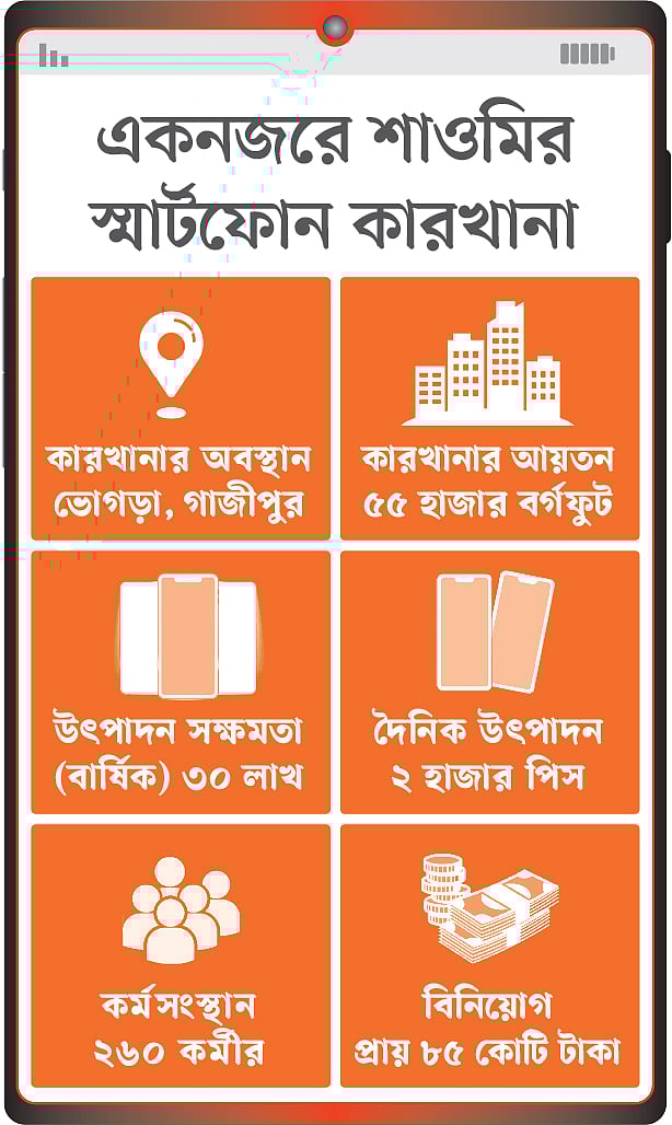 দেশের ভেতরে স্মার্টফোন সংযোজন কারখানা স্থাপনের তালিকায় সর্বশেষ যুক্ত হলো শাওমি। চীনা এই ব্র্যান্ডের জন্য স্মার্টফোন সংযোজন করবে তাদেরই সহযোগী প্রতিষ্ঠান ডিবিজি টেকনোলজি বিডি লিমিটেড। গাজীপুরের ভোগড়ায় ৫৫ হাজার বর্গফুট আয়তনের কারখানাটিতে বছরে ৩০ লাখ স্মার্টফোন বানাবে শাওমি বাংলাদেশ। তবে বর্তমানে দৈনিক আট ঘণ্টার শিফট বা পালায় দুই হাজার স্মার্টফোন তৈরি হচ্ছে। তাতে মাসে উৎপাদন হবে ৫০ হাজার স্মার্টফোন। আগামী জানুয়ারিতে নতুন লাইন চালু হলে স্মার্টফোন উৎপাদন আরও বাড়বে।
