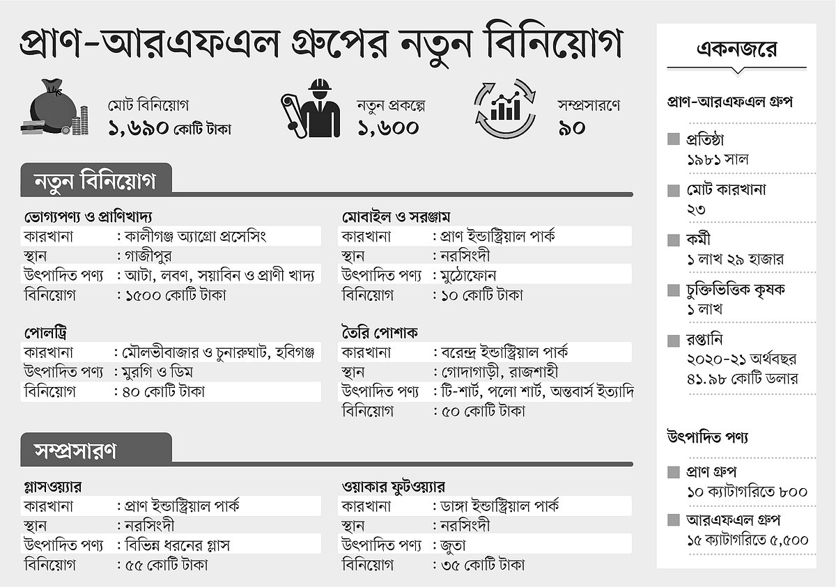 নতুন এই বিনিয়োগ নিয়ে গত ৩০ ডিসেম্বর প্রথম আলোর সঙ্গে কথা বলেন প্রাণ-আরএফএল গ্রুপের চেয়ারম্যান ও প্রধান নির্বাহী কর্মকর্তা আহসান খান চৌধুরী। তিনি বলেন, ‘করোনার মধ্যে গত বছর নতুন কয়েকটি দেশে পণ্য রপ্তানি করেছি। রপ্তানির তালিকায় নতুন পণ্য যুক্ত হয়েছে। গত বছর যে বীজ বপন করেছি, সেটির ফল চলতি বছর পাব। আগামী দিনে দেশে কৃষিপণ্যের ব্যাপক চাহিদা বাড়বে। সে কারণে আমরা নতুন বিনিয়োগে যাচ্ছি।’