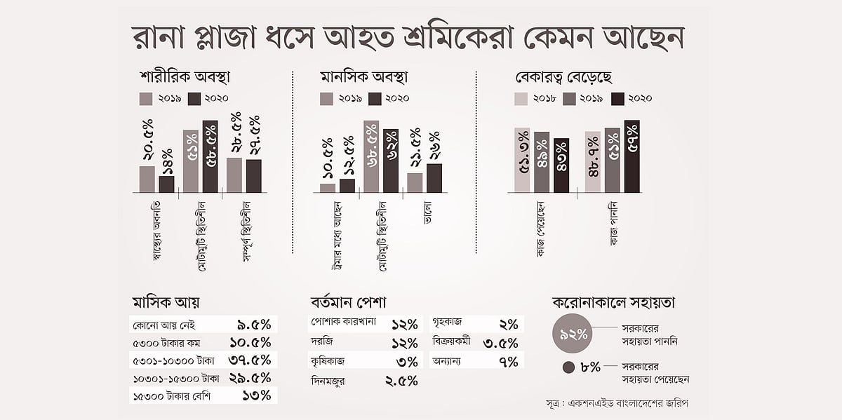 ভবনধসে আহত পোশাকশ্রমিকদের মধ্যে ২০১৯ সালে বেকার ছিলেন ৫১ শতাংশ। গত বছর করোনাকালে সেটি বেড়ে ৫৭ শতাংশ হয়েছে, যা গত ছয় বছরের মধ্যে সর্বোচ্চ। আহতদের মধ্যে কাজে আছেন ৪৩ শতাংশ। তাঁদের মধ্যে মাত্র ১২ শতাংশ পোশাক কারখানায় কাজ করেন। এর বাইরে ১২ শতাংশ দরজি দোকানে, ৩ শতাংশ কৃষি খাতে, আড়াই শতাংশ দিনমজুরি, ২ শতাংশ গৃহকাজে নিয়োজিত। এ ছাড়া সাড়ে ৩ শতাংশ বিক্রয়কর্মী হিসেবে এবং ৭ শতাংশ অন্যান্য কাজ করেন।