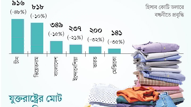 ইউএস ডিপার্টমেন্ট অব কমার্সের আওতাধীন অফিস অব টেক্সটাইল অ্যান্ড অ্যাপারেলের (অটেক্সা) দেওয়া পরিসংখ্যান থেকে এসব তথ্য জানা গেছে। এতে দেখা যায়, চলতি বছরের জানুয়ারি-আগস্ট সময়ে বাজারটিতে যে পরিমাণ পোশাক রপ্তানি হয়েছে, তার ৫৭ শতাংশ করেছে চীন, ভিয়েতনাম, বাংলাদেশ, ইন্দোনেশিয়া, ভারত ও মেক্সিকো। তবে রপ্তানি কমার দিক থেকে এই পাঁচ দেশের মধ্যে বাংলাদেশ দ্বিতীয় সর্বনিম্ন অবস্থানে রয়েছে।