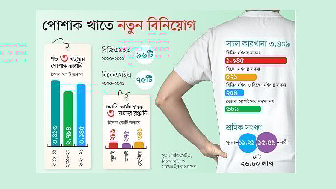 ইতিমধ্যে করোনার ধাক্কা কাটিয়ে পোশাক রপ্তানি ঘুরে দাঁড়িয়েছে। গত জুনে শেষ হওয়া অর্থবছরে ৩ হাজার ১৪৫ কোটি ডলারের পোশাক রপ্তানি হয়েছে, যা আগের বছরের চেয়ে সাড়ে ১২ শতাংশ বেশি। চলতি অর্থবছরের প্রথম মাসে রপ্তানি প্রবৃদ্ধি ভালো না হলেও পরের দুই মাসে পরিস্থিতির উন্নতি হয়েছে। গত মাসে ৩৪২ কোটি ডলারের পোশাক রপ্তানি হয়েছে, যা গত বছরের একই সময়ের চেয়ে ৪২ শতাংশ বেশি। এটিই পোশাক খাতের ইতিহাসে এক মাসে সর্বোচ্চ রপ্তানি। সব মিলিয়ে চলতি অর্থবছরের প্রথম তিন মাসে রপ্তানি হয়েছে ৯০৫ কোটি ডলারের পোশাক। এই আয় গত বছরের একই সময়ের চেয়ে সাড়ে ১১ শতাংশ বেশি।