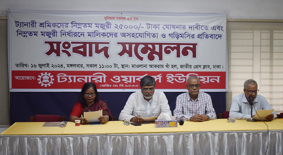 ঢাকায় জাতীয় প্রেসক্লাবে আজ মঙ্গলবার এক সংবাদ সম্মেলনে বাংলাদেশ ট্যানারি ওয়ার্কার্স ইউনিয়নের নেতারা এসব কথা বলেন। ইউনিয়নের সভাপতি আবুল কালাম আজাদের সভাপতিত্বে সংবাদ সম্মেলনে লিখিত বক্তব্য পাঠ করেন সংগঠনের সাধারণ সম্পাদক আবদুল মালেক। এ সময় আরও উপস্থিত ছিলেন শ্রমিক কর্মচারী ঐক্য পরিষদের (স্কপ) যুগ্ম সমন্বয়কারী নইমূল আহসান জুয়েল ও বাংলাদেশ জাতীয় শ্রমিক ফেডারেশনের সভাপতি শামীম আরা।