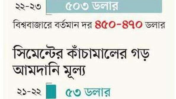 কাঁচামালের পাশাপাশি আমদানি মূল্যও কিছুটা কমেছে। রাশিয়া–ইউক্রেন যুদ্ধের পর ক্লিংকারের আমদানি মূল্য উঠেছিল টনপ্রতি ৬৯ ডলারে। সেখান থেকে কমে চলতি অর্থবছরের সাড়ে তিন মাসে গড় আমদানি মূল্য পড়ছে ৬১ ডলার। বিশ্ববাজার থেকে এখন টনপ্রতি ক্লিংকার আমদানিতে খরচ পড়বে ৫৬–৫৮ ডলার। গত বছরের একই সময়ে ছিল ৫৩ ডলার।