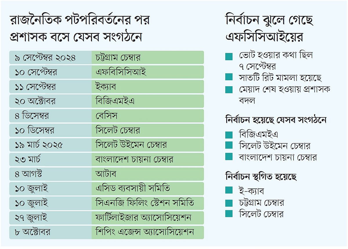 ক্ষমতাচ্যুত আওয়ামী লীগ সরকারের দেড় দশকে ব্যবসায়ীদের শীর্ষ সংগঠন এফবিসিসিআইসহ বাণিজ্য সংগঠনগুলো সরকারের ব্যবসায়ী শাখায় পরিণত হয়েছিল। ভোট ছাড়াই সরকারঘনিষ্ঠ ব্যবসায়ীরা বছরের পর বছর সংগঠনগুলোর পদ আঁকড়ে ছিলেন। রাজনৈতিক পটপরিবর্তনের পর এফবিসিসিআইসহ বিভিন্ন সংগঠনে প্রশাসক বসায় অন্তর্বর্তী সরকার। তারপর এক বছরের বেশি সময় পার হলেও ভোটের মাধ্যমে অধিকাংশ সংগঠনের নেতৃত্ব প্রকৃত ব্যবসায়ীদের হাতে তুলে দিতে পারেনি সরকার।