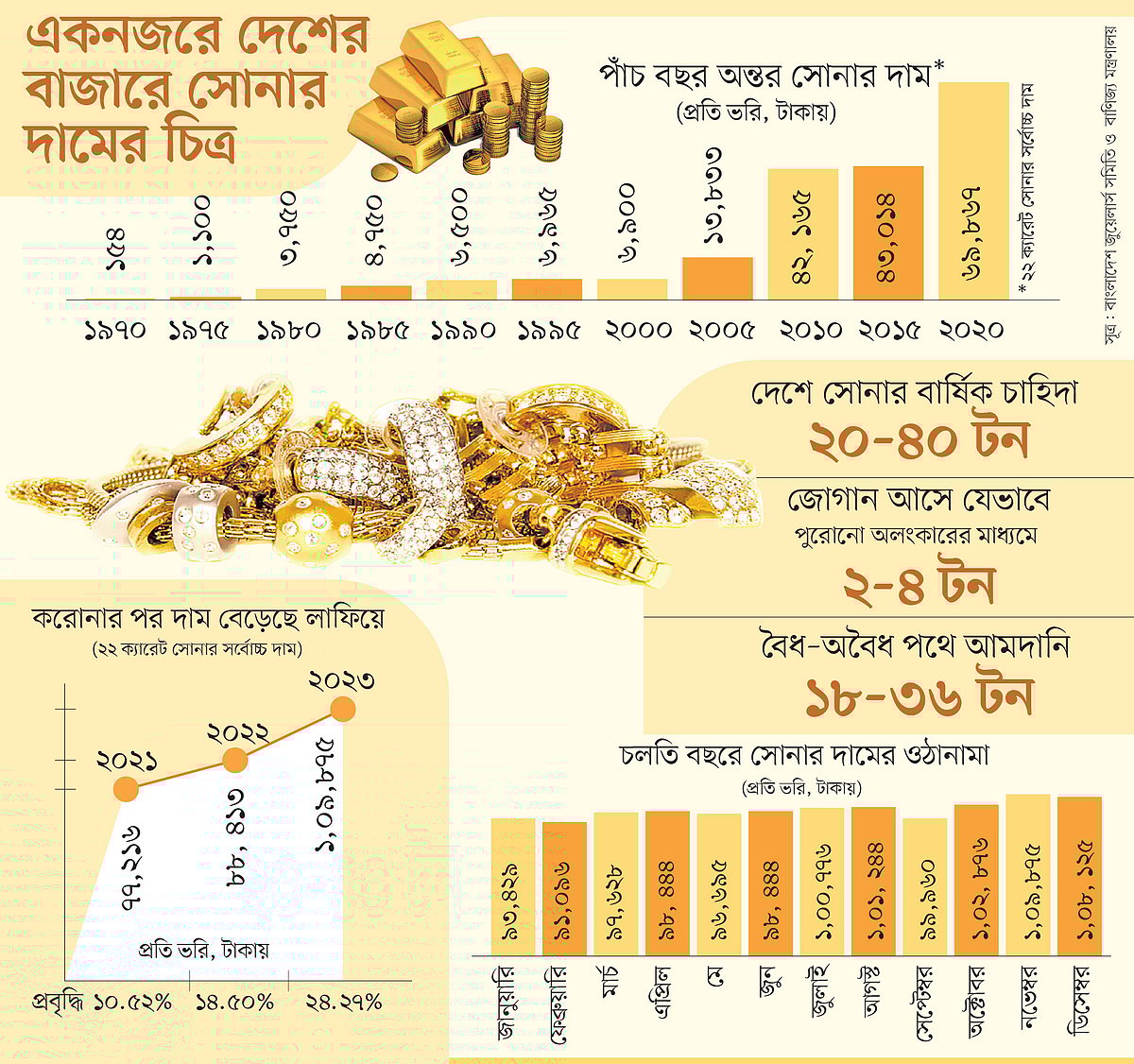 বিশ্বজুড়ে সোনার বিপুল চাহিদা ও জোগানের ভিড়ে বাংলাদেশের বাজার খুবই ছোট। এখানে সুনির্দিষ্ট হিসাবও নেই। তবে মনে করা হয়, দেশে বছরে ২০-৪০ টন সোনার চাহিদা রয়েছে। এর মাত্র ১০ শতাংশ চাহিদা পূরণ হয় পুরোনো অলংকার দিয়ে। বাকিটা ব্যাগেজ রুলের আওতায় বিদেশ থেকে আসে। অবৈধভাবেও প্রচুর সোনা আসে। জুয়েলারি ব্যবসায় স্বচ্ছতা ফেরাতে সোনা আমদানির লাইসেন্স দেওয়া হয়। শুরুতে কিছু আমদানি হলেও নানা জটিলতায় পরে তা শ্লথ হয়ে যায়।