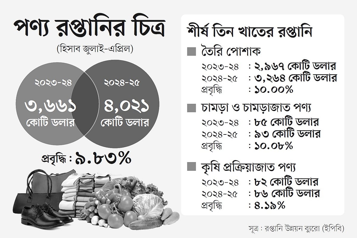 রপ্তানি উন্নয়ন ব্যুরোর (ইপিবি) তথ্যানুযায়ী, চলতি ২০২৪–২৫ অর্থবছরের প্রথম ১০ মাসে (জুলাই–এপ্রিল) ৪ হাজার ২১ কোটি মার্কিন ডলারের পণ্য রপ্তানি হয়েছে। এ রপ্তানি গত অর্থবছরের একই সময়ের তুলনায় ৯ দশমিক ৮ শতাংশ বেশি। এ ধারা বজায় থাকলে অর্থবছর শেষে পণ্য রপ্তানি সাড়ে চার হাজার কোটি ডলার ছাড়িয়ে যাবে।