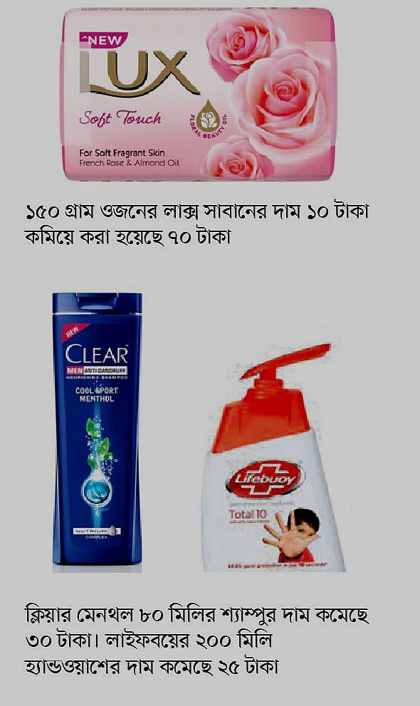ইউবিএল সূত্রে জানা গেছে, সাবান, শ্যাম্পু ও হ্যান্ডওয়াশের দাম সর্বনিম্ন ১০ থেকে সর্বোচ্চ ৩০ টাকা পর্যন্ত কমানো হয়েছে। এর মধ্যে ১৫০ গ্রাম ওজনের লাক্স সাবানের দাম ১০ টাকা কমিয়ে করা হয়েছে ৭০ টাকা। একই ওজনের লাইফবয় সাবানের দামও ১০ টাকা কমিয়ে ৫০ টাকা করা হয়েছে। এ ছাড়া লাক্স সাবানের ১০০ গ্রামের প্যাকেটে ওজনে ২৫ গ্রাম বেশি দেওয়া হচ্ছে। তাতে ১০০ গ্রামের লাক্সের প্যাকেটের প্রকৃত দাম পড়ছে ৪৮ টাকা।