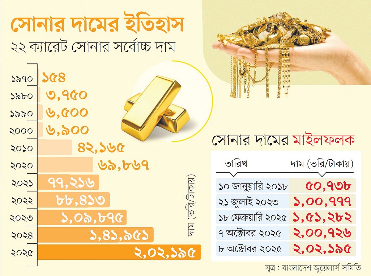 বাংলাদেশ জুয়েলার্স সমিতির তথ্য বিশ্লেষণ করে দেখা যায়, স্বাধীনতাযুদ্ধের সময় সোনার ভরি ছিল ১৭০ টাকা। ১০ বছরের ব্যবধানে দাম বেড়ে হয় ৩ হাজার ৭৫০ টাকা। পরের ২০ বছরে সোনার দাম দ্বিগুণ হয়। ২০০০ সালে ২২ ক্যারেটের সোনার ভরি ছিল সর্বোচ্চ ৬ হাজার ৯০০ টাকা। এর পরের দশকে ধাতুটির দাম দ্রুতগতিতে বাড়ে। ২০১০ সালে প্রতি ভরির দাম ছিল ৪২ হাজার ১৬৫ টাকা।