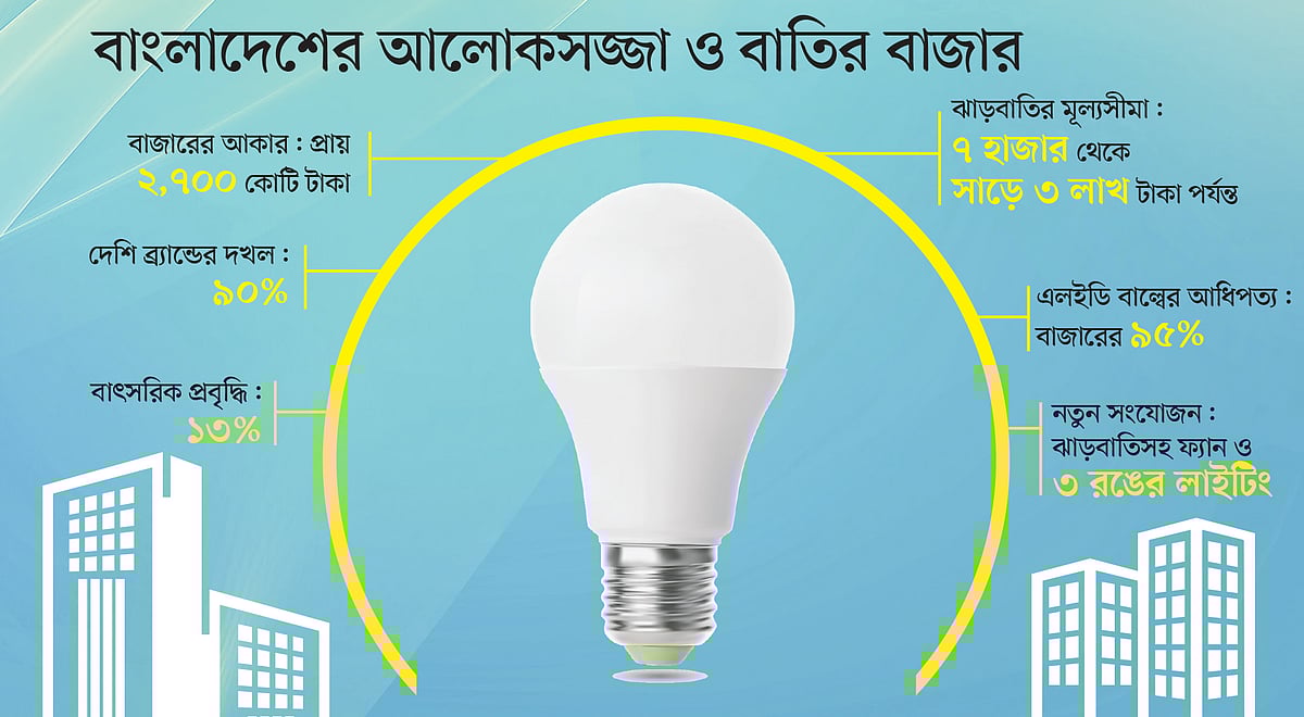 দেশে আলোকসজ্জার বাতির বাজার এখন প্রায় ২ হাজার ৭০০ কোটি টাকার। আশার কথা হলো, এই বাজারের প্রায় ৯০ শতাংশই এখন দেশি কোম্পানিগুলোর দখলে। শীর্ষস্থানীয় ব্র্যান্ডগুলোর মধ্যে সুপার স্টার, ওয়ালটন, ক্লিক, ট্রান্সটেক ও এনার্জিপ্যাক উল্লেখযোগ্য। তবে শহরাঞ্চলে ব্র্যান্ডের আধিপত্য থাকলেও গ্রামাঞ্চলে এখনো নিম্নমানের নকল ও অনুমোদনহীন নন-ব্র্যান্ডেড বাল্বের দাপট রয়েছে। বিপণন পর্যবেক্ষণকারী সংগঠন মার্কেটিং ওয়াচ বাংলাদেশের (এমডব্লিউবি) মতে, লাইটিং পণ্যের বার্ষিক প্রবৃদ্ধির হার প্রায় ১৩ শতাংশ।