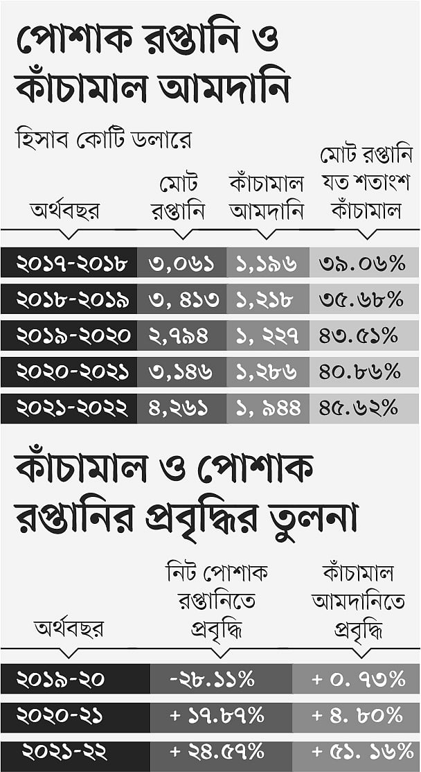 বিদায়ী ২০২১-২২ অর্থবছরে ৪ হাজার ২৬১ কোটি ডলারের তৈরি পোশাক রপ্তানি হয়েছে। এ জন্য কাঁচামাল আমদানি করতে হয়েছে ১ হাজার ৯৪৪ কোটি ডলারের। তাতে মোট পোশাক রপ্তানির ৪৫ দশমিক ৬২ শতাংশই কাঁচামালের পেছনে ব্যয় হয়েছে।