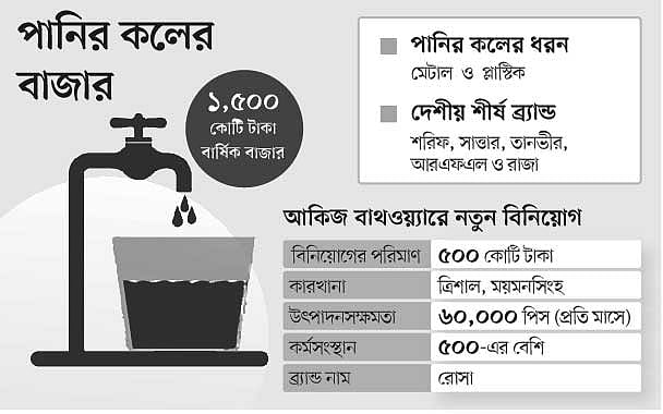 পানির কলের বাজারে দেশীয় বড় বিনিয়োগ কম। ৫১ শতাংশই বিদেশি পণ্যের দখলে। বাজার ধরতে আকিজ বাথওয়্যার বড় বিনিয়োগ করেছে।