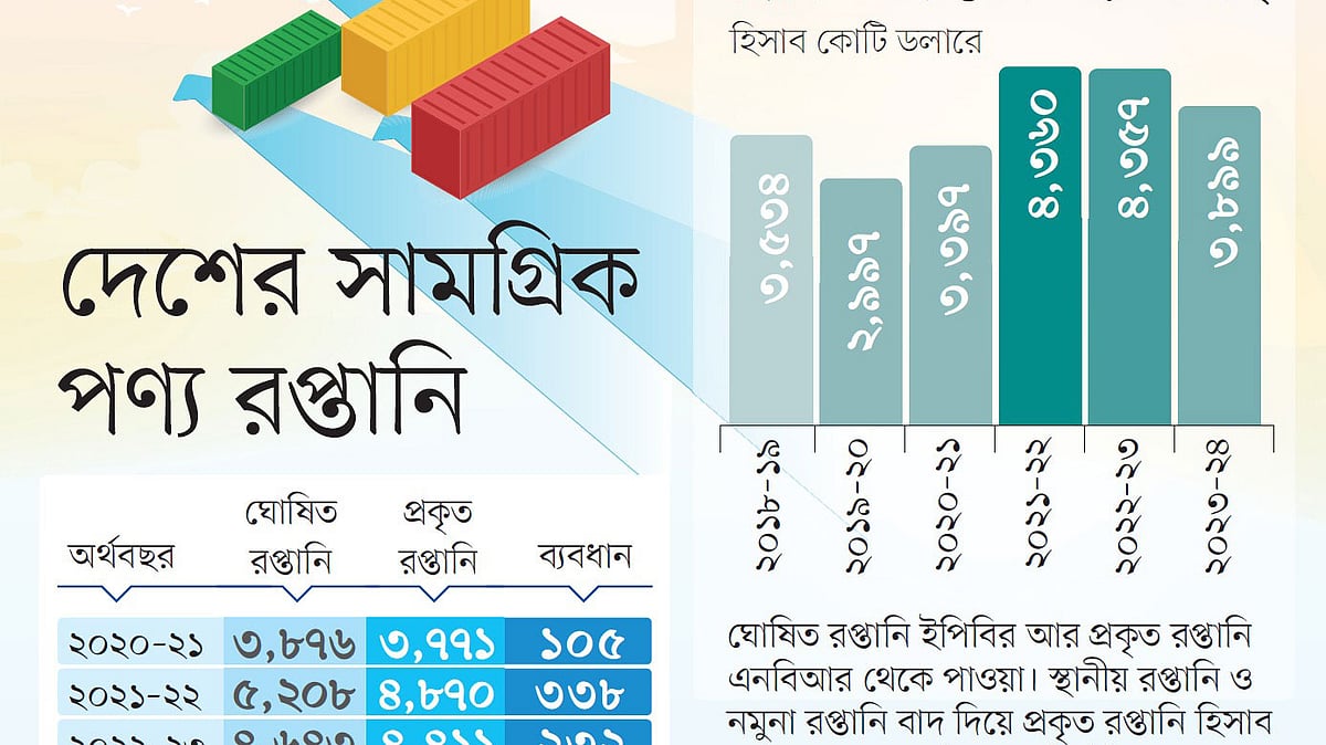বিদায়ী ২০২৪-২৫ অর্থবছর শেষে ইপিবি রপ্তানির যে পরিসংখ্যান প্রকাশ করেছে, সেখানে সরাসরি পণ্য রপ্তানির সঙ্গে স্থানীয় রপ্তানি ও নমুনা (স্যাম্পল) রপ্তানির হিসাবও যুক্ত রয়েছে। এতে প্রায় ২ বিলিয়ন ডলার রপ্তানি বেশি দেখানো হয়েছে। ফলে সদ্য বিদায়ী ২০২৪-২৫ অর্থবছরেও পণ্য রপ্তানির প্রকৃত চিত্র পাওয়া যায়নি।