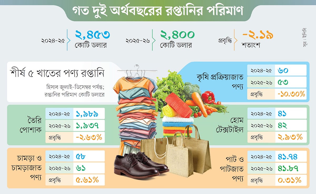 শীর্ষ পাঁচ খাতের মধ্যে চামড়া ও চামড়াজাত পণ্য, হোম টেক্সটাইল এবং পাট ও পাটজাত পণ্যের রপ্তানিতে চলতি অর্থবছরের প্রথমার্ধে ইতিবাচক প্রবৃদ্ধি দেখা গেছে। তবে তিন খাতের রপ্তানি ডিসেম্বরে কমেছে।