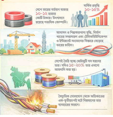দেশে বাসাবাড়ি ও শিল্পকারখানা বৃদ্ধির সঙ্গে দিন দিন বৈদ্যুতিক কেব্ল বা তারের ব্যবহারও বাড়ছে। বিশেষ করে গত দুই দশকে নির্মাণ ও টেলিকমিউনিকেশন খাতে কেবলের ব্যবহার বেড়েছে কয়েক গুণ। চাহিদা বাড়তে থাকায় দেশীয় কোম্পানিগুলো এ খাতে বিনিয়োগ বাড়িয়েছে। তাতে কমেছে আমদানি। পাশাপাশি এ খাতে কর্মসংস্থানও বাড়ছে।
