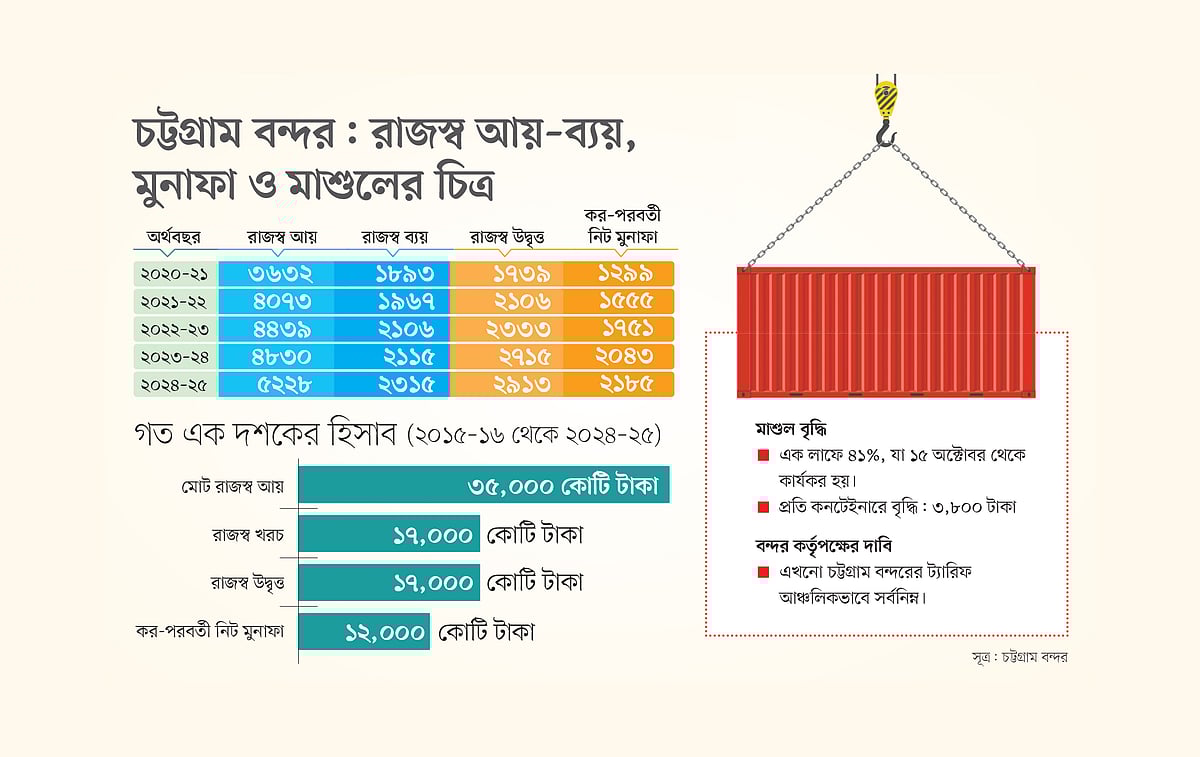 চট্টগ্রাম বন্দর কর্তৃপক্ষের হিসাবে, ২০২৪–২৫ অর্থবছরে বন্দরের খরচ বাদ দিয়ে রাজস্ব উদ্বৃত্ত ছিল ২ হাজার ৯১২ কোটি টাকা। কর পরিশোধের পর নিট মুনাফা দাঁড়িয়েছে ২ হাজার ১৮৪ কোটি টাকা। এমন পরিস্থিতিতে ১৫ অক্টোবর থেকে বর্ধিত হারে মাশুল আদায় শুরু হয়। এতে আগামী বছরগুলোতে বন্দরের আয় আরও বাড়বে বলে ধারণা করা হচ্ছে।