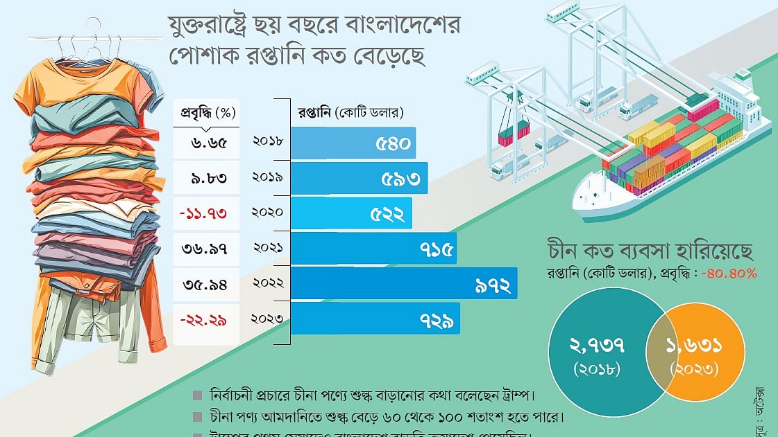 প্রথমবার ডোনাল্ড ট্রাম্প ক্ষমতায় থাকার সময় ২০১৮ সালে যুক্তরাষ্ট্র ও চীনের মধ্যে বাণিজ্যযুদ্ধ শুরু হয়। এর ফলে ২০১৯ সালে চীন থেকে ক্রয়াদেশ সরতে থাকে। চীনের হারানো ক্রয়াদেশের একটি অংশ বাংলাদেশও পেয়েছিল। ফলে ওই বছর যুক্তরাষ্ট্রে ৫৯৩ কোটি ডলারের পোশাক রপ্তানি হয়, যা তার আগের সাত বছরের মধ্যে সর্বোচ্চ ছিল। এর মধ্যে করোনার কারণে রপ্তানি কমলেও ২০২২ সালে যুক্তরাষ্ট্রের বাজারে ৯৭২ কোটি ডলারের তৈরি পোশাক রপ্তানি করে বাংলাদেশ। যদিও পরের বছর রাশিয়া-ইউক্রেন যুদ্ধের কারণে পোশাক রপ্তানি কমে যায়।