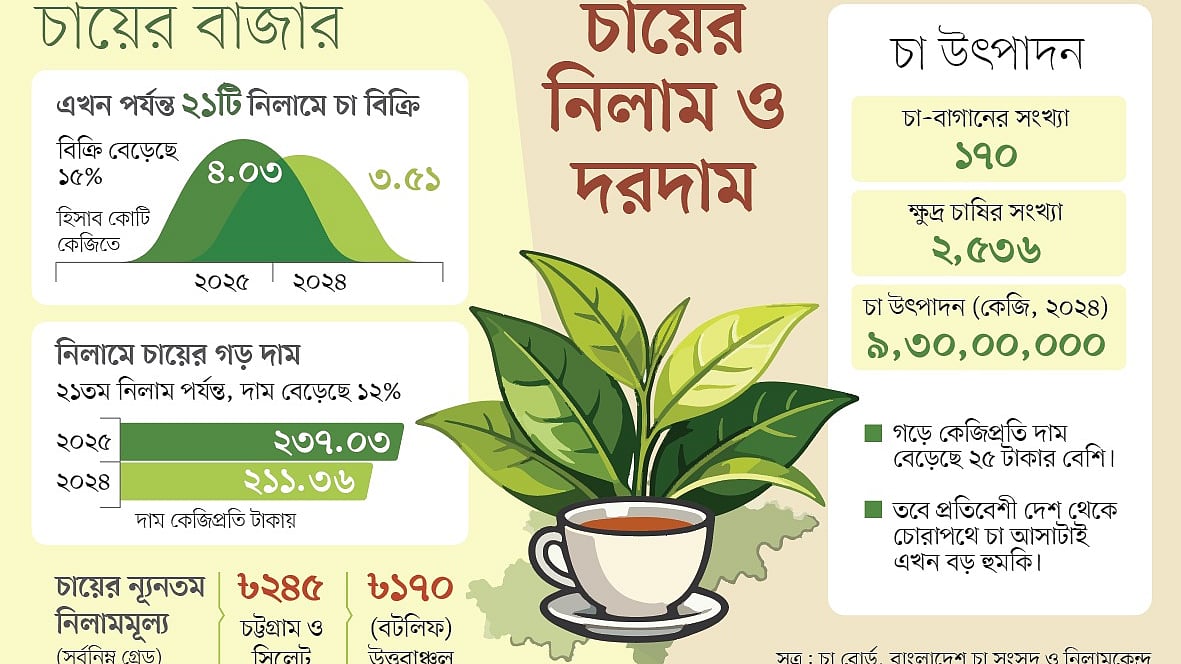 চট্টগ্রামের চা নিলামকেন্দ্রের হিসাবে, চলতি মৌসুমের প্রথম ২১টি নিলামে চা বিক্রি হয়েছে ৪ কোটি ৩ লাখ কেজি। গত মৌসুমের একই সময়ে বিক্রি হয়েছিল ৩ কোটি ৫১ লাখ কেজি। সেই হিসাবে চা বেচাকেনা গতবারের চেয়ে বেড়েছে ১৫ শতাংশ।