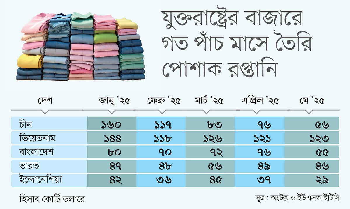যুক্তরাষ্ট্রের বাজারে পণ্য রপ্তানিতে গত এপ্রিলে প্রাথমিকভাবে ১০ শতাংশ ন্যূনতম পাল্টা শুল্ক কার্যকর করে দেশটির প্রশাসন। তার পরের মাসেই চীন ও বাংলাদেশের তৈরি পোশাক রপ্তানিতে ধস নেমেছে। তবে প্রতিযোগী দেশ ভিয়েতনামের রপ্তানি বেড়েছে। সুবিধাজনক অবস্থায় আছে ভারত।
