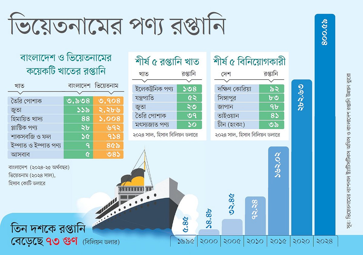 বাংলাদেশের সঙ্গে অনেক জায়গায় ভিয়েতনামের মিল রয়েছে। দুটি দেশই কৃষিনির্ভর অর্থনীতি ছিল। দীর্ঘ যুদ্ধের পর ১৯৭৫ সালে ভিয়েতনাম এক হয়। তার চার বছর আগে বাংলাদেশ স্বাধীন হয়। নব্বইয়ের দশকে বাংলাদেশ ও ভিয়েতনাম উভয়েরই তৈরি পোশাক দিয়েই অর্থনীতির বাঁকবদল শুরু হয়। যদিও পরে ভিয়েতনাম বৈচিত্র্যময় বিদেশি বিনিয়োগ আকৃষ্ট করে দ্রুত এগিয়ে যায়। সে তুলনায় বাংলাদেশ চার দশক ধরে এক তৈরি পোশাকনির্ভর রয়ে গেছে।