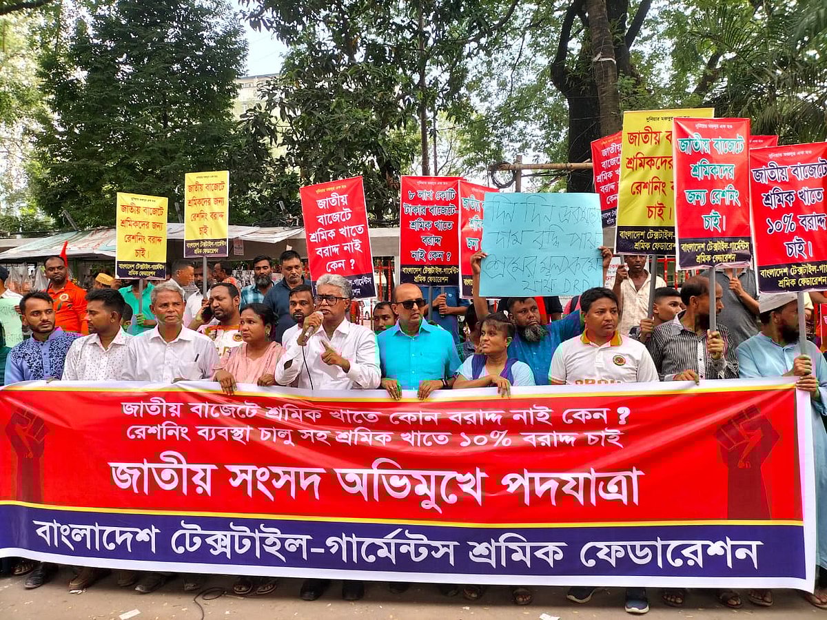 ২০২৪-২৫ অর্থবছরের বাজেটে শ্রমিকদের জন্য রেশন বরাদ্দ বৃদ্ধিসহ আট দফা দাবিতে সংসদ অভিমুখে পদযাত্রা করেছে বাংলাদেশ টেক্সটাইল গার্মেন্টস শ্রমিক ফেডারেশন। সংগঠনটি বলেছে, শ্রমিকদের রেশনিংয়ের জন্য বাজেটের ১০ শতাংশ বরাদ্দ রাখতে হবে।