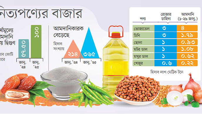 এনবিআরের হিসাবে, গত ১ থেকে ২৯ জানুয়ারি সময়ে আমদানি হওয়া পেঁয়াজ, ছোলা, মটর ও মসুর ডাল, ভোজ্যতেল পাম ও সয়াবিনের কাঁচামাল, চিনি, গম ও খেজুরের মোট দাম ১০০ কোটি মার্কিন ডলার, যা গত বছরের একই সময়ের তুলনায় প্রায় ৭৪ শতাংশ বেশি। আমদানির পরিমাণ মোট ১৬ লাখ ২৪ হাজার টন।