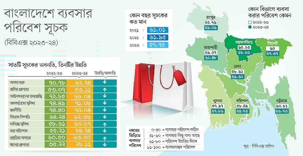 জরিপের তথ্যানুযায়ী, ২০২১ সালে সামগ্রিকভাবে ব্যবসার পরিবেশ সূচকের ১০০ নম্বরের মধ্যে বাংলাদেশ পেয়েছিল ৬১ দশমিক শূন্য ১। পরের বছর অর্থাৎ ২০২২ সালে সেটি সামান্য বেড়ে ৬১ দশমিক ৯৫ হয়। ২০২৩ সালে প্রাপ্ত নম্বর ৫৮ দশমিক ৭৫। সূচকের মানে অবনমনের কারণ, ১১টি সূচকের মধ্যে ৭টিতেই অবনতি হয়েছে। তিনটি সূচক সামান্য উন্নতির দিকে।
