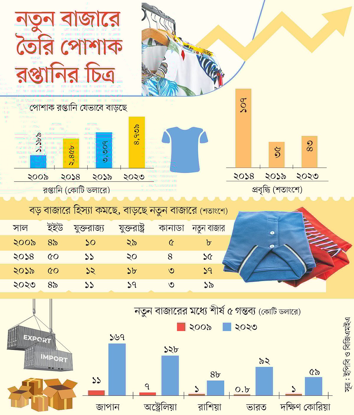 ২০০৯ সালে বাংলাদেশের তৈরি পোশাক রপ্তানির ৫৮ দশমিক ৯০ শতাংশের গন্তব্য ছিল ইউরোপীয় ইউনিয়ন (ইইউ)। ইইউ জোটে তখন যুক্তরাজ্যও ছিল। এ ছাড়া যুক্তরাষ্ট্রে ২৮ দশমিক ৭০ শতাংশ এবং কানাডায় ৪ দশমিক ৮৬ শতাংশ পোশাক রপ্তানি হতো। তার মানে, রপ্তানি হওয়া তৈরি পোশাকের সাড়ে ৯২ শতাংশের গন্তব্য ছিল প্রচলিত বাজারগুলো। সে সময় নতুন বাজারের হিস্যা ছিল মাত্র সাড়ে ৭ শতাংশ।