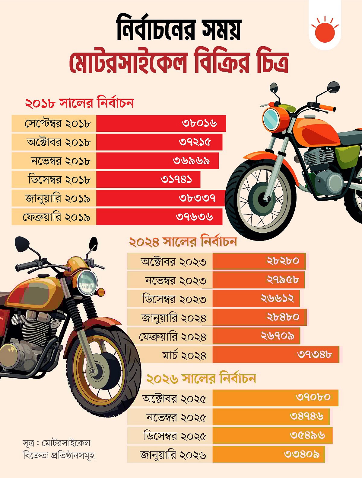 এসব প্রতিষ্ঠানের তথ্যমতে, ২০২৪ সালের নির্বাচনের আগে ২০২৩ সালের অক্টোবর মাসে মোটরসাইকেল বিক্রি হয়েছিল ২৮ হাজারের বেশি। ডিসেম্বর মাসে কমে হয়েছে প্রায় সাড়ে ২৬ হাজারের বেশি মোটরসাইকেল। আর নির্বাচনের মাসে সেই বিক্রি বেড়ে হয়েছিল ২৮ হাজার ৪৮০টি। এরপর ফেব্রুয়ারি মাসে মোটরসাইকেল বিক্রির সংখ্যা কমে হয়েছে ২৬ হাজার ৭০৯টি।