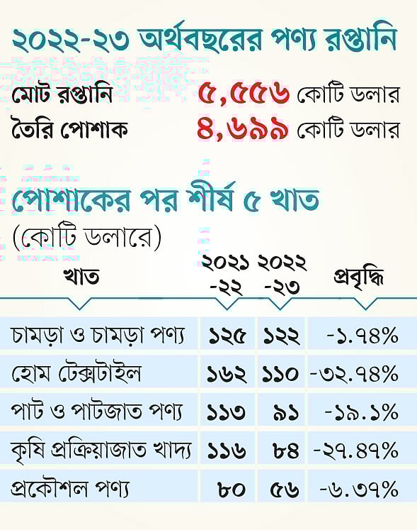 তৈরি পোশাকের কল্যাণে সদ্য বিদায়ী ২০২২–২৩ অর্থবছর সামগ্রিক পণ্য রপ্তানি ইতিবাচক ধারায় থাকলেও বড় কয়েকটি খাতের রপ্তানির তথ্য দুশ্চিন্তায় ফেলেছে। কারণ, পোশাকের পর বড় পাঁচ খাতের রপ্তানি কমে গেছে। এর ফলে এক বছরের ব্যবধানে ১ বিলিয়ন বা ১০০ কোটি ডলার রপ্তানির ক্লাব থেকে বেরিয়ে গেছে দুটি খাত।