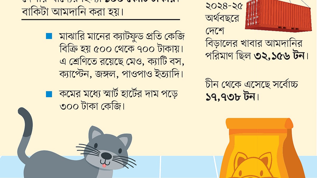 তবে এখনো ক্যাট ফুডের চাহিদার প্রায় পুরোটাই আমদানিনির্ভর। দেশে ২০টির মতো প্রতিষ্ঠান বিদেশ থেকে ক্যাট ফুড আমদানি করে থাকে। এর একটি হলো বার্ড প্যালেস। প্রতিষ্ঠানটির স্বত্বাধিকারী বাবুল হাওলাদার বলেন, ‘করোনার সময় মানুষ বাসায় আবদ্ধ থেকে পোষা প্রাণিপ্রেমী হয়ে গেছেন। তাই করোনার পর থেকে হুট করে এই বাজার বড় হয়ে যায়।’ তবে আওয়ামী লীগ সরকারের পতনের পর বিত্তবান শ্রেণির গ্রাহক কমে গেছে বলে জানান তিনি।