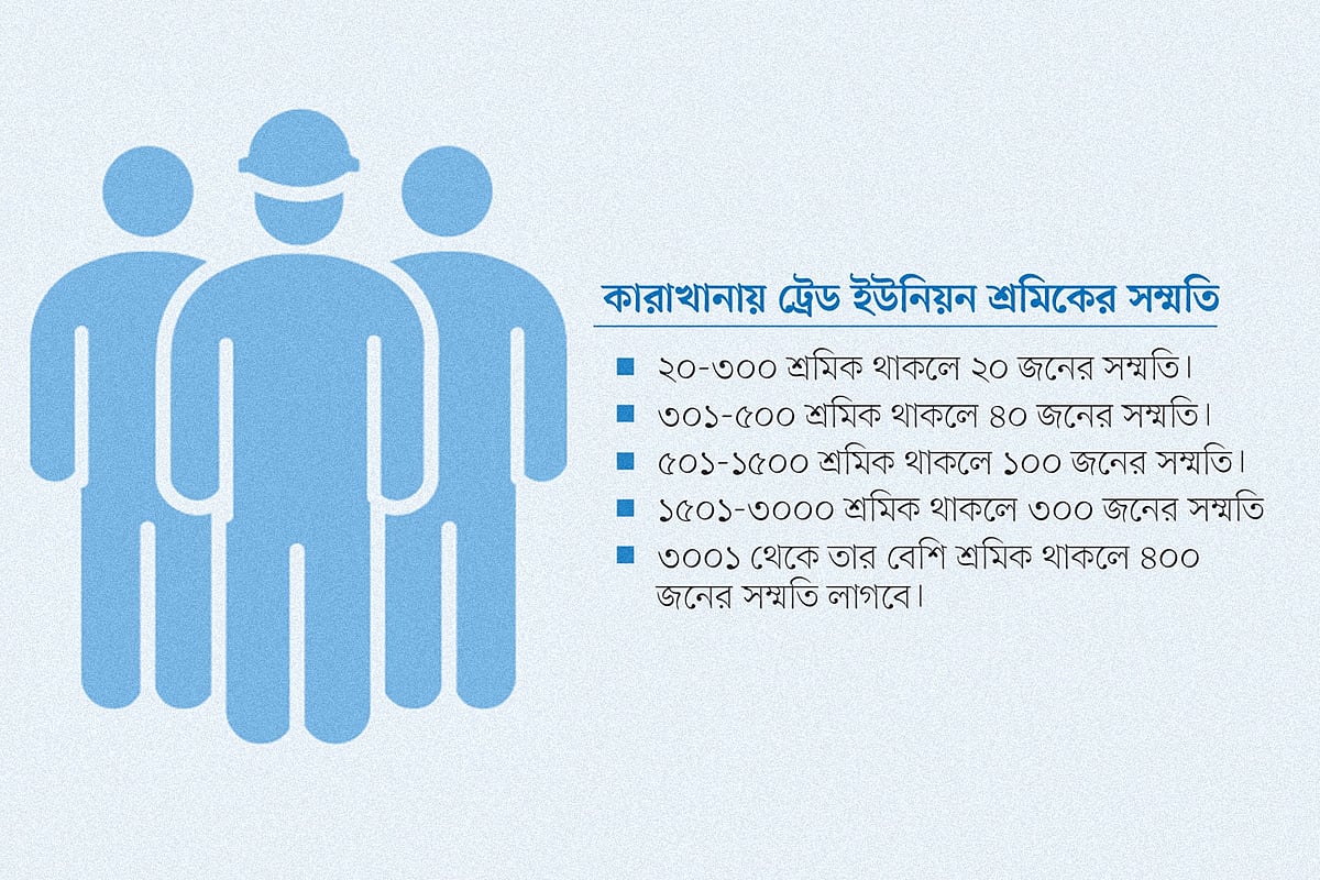 শ্রম ও কর্মসংস্থান মন্ত্রণালয়ের সূত্রগুলো জানায়, কারখানার আকার অনুযায়ী শ্রমিকের সংখ্যা বেঁধে দেওয়া হয়েছে। বলা হয়েছে, ২০ থেকে ৩০০ জন শ্রমিক থাকা প্রতিষ্ঠানের ক্ষেত্রে ২০ জন, ৩০১ থেকে ৫০০ জন শ্রমিক থাকা প্রতিষ্ঠানের ক্ষেত্রে ৪০ জন, ৫০১ থেকে ১ হাজার ৫০০ জন শ্রমিক থাকা প্রতিষ্ঠানের ক্ষেত্রে ১০০ জন, ১ হাজার ৫০১ থেকে তিন হাজার শ্রমিক থাকা প্রতিষ্ঠানের ক্ষেত্রে ৩০০ জন এবং তিন হাজার ১ থেকে তার বেশি শ্রমিক থাকা প্রতিষ্ঠানে ৪০০ জন শ্রমিকের সম্মতি লাগবে ট্রেড ইউনিয়ন করতে গেলে।