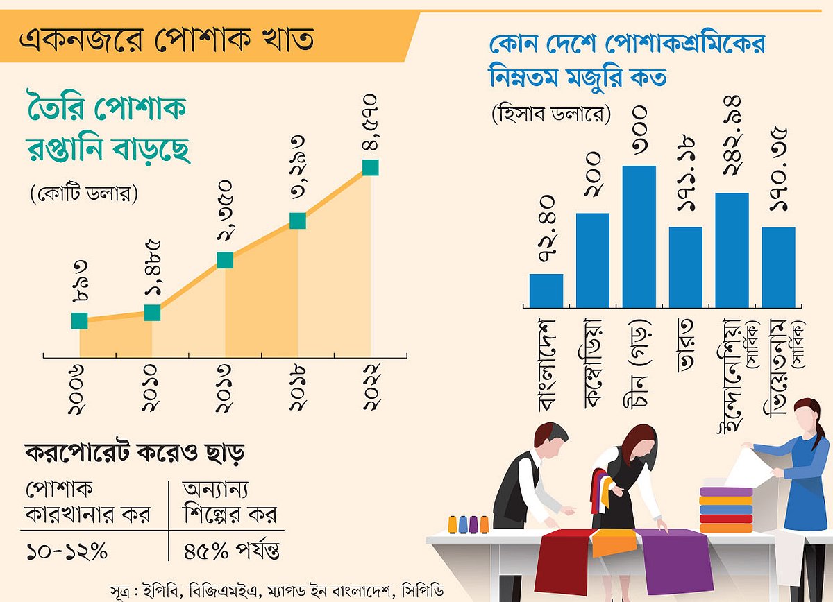 অভ্যন্তরীণ ও দেশের বাইরের সংকটের মধ্যেও ব্যবসা বা রপ্তানি ও নানা রকম সুবিধা পাওয়ায় এগিয়ে থাকলেও শ্রমিকের মজুরি দেওয়ায় প্রতিযোগী দেশগুলোর চেয়ে পিছিয়ে রয়েছে বাংলাদেশের তৈরি পোশাক খাত। ভারত, কম্বোডিয়া, চীন, ইন্দোনেশিয়া, ভিয়েতনাম ও পাকিস্তানের পোশাকশ্রমিকেরা বাংলাদেশের চেয়ে বেশি মজুরি পান। শুধু তাই নয়, দেশের কয়েকটি গুরুত্বপূর্ণ শিল্পের তুলনায়ও কম মজুরি দিচ্ছে শীর্ষ রপ্তানি আয়ের এই খাত।